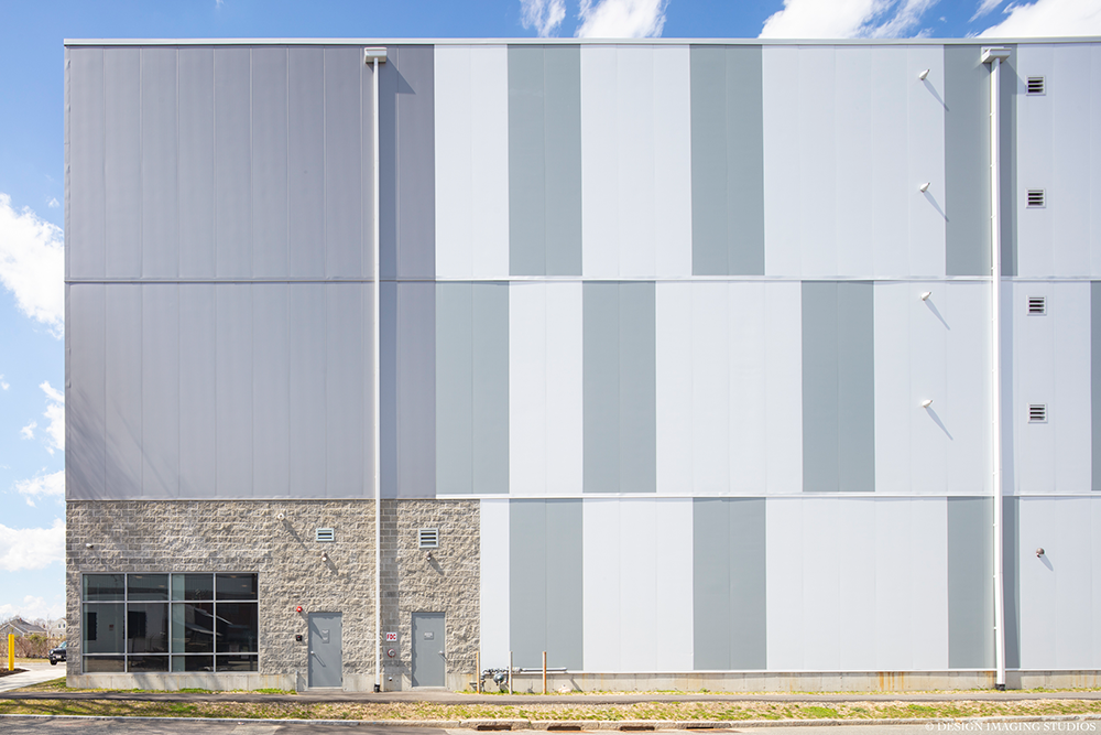 The facade features a visually striking composition using alternating vertical panels in Regent Gray and Pewter, creating a clean, contemporary rhythm across the elevations. A combination of Micro Rib and Silkline Plus profiles adds subtle texture while maintaining a sleek and professional appearance. The vertical orientation of the panels emphasizes the building’s height and complements the stacked-glass corner tower, which brings light into the facility and serves as a visual anchor.